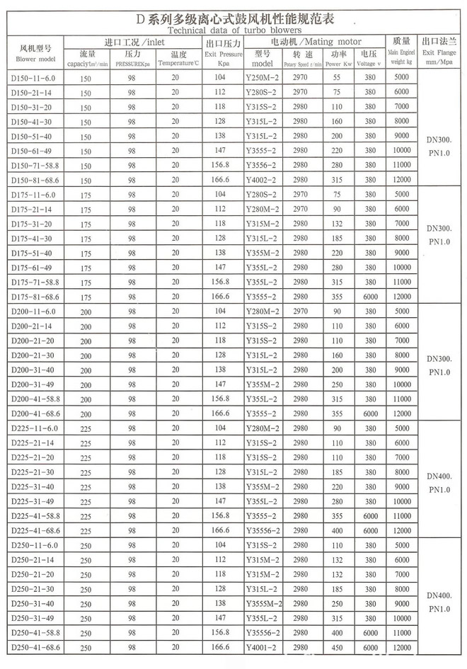 D系列多級(jí)離心式鼓風(fēng)機(jī)性能規(guī)范表